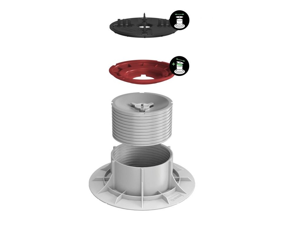 Výškovo nastaviteľný a samonivelačný ( reguluje spád do 5% ) terč pod dlažbu. Univerzálna hlava má protišmykovú a protihlukovú vrstvu s tromi dištančnými planžetami šírky 2, 3 a 4mm Možnosť regulovať výšku aj po položení dlažby. Patentované.