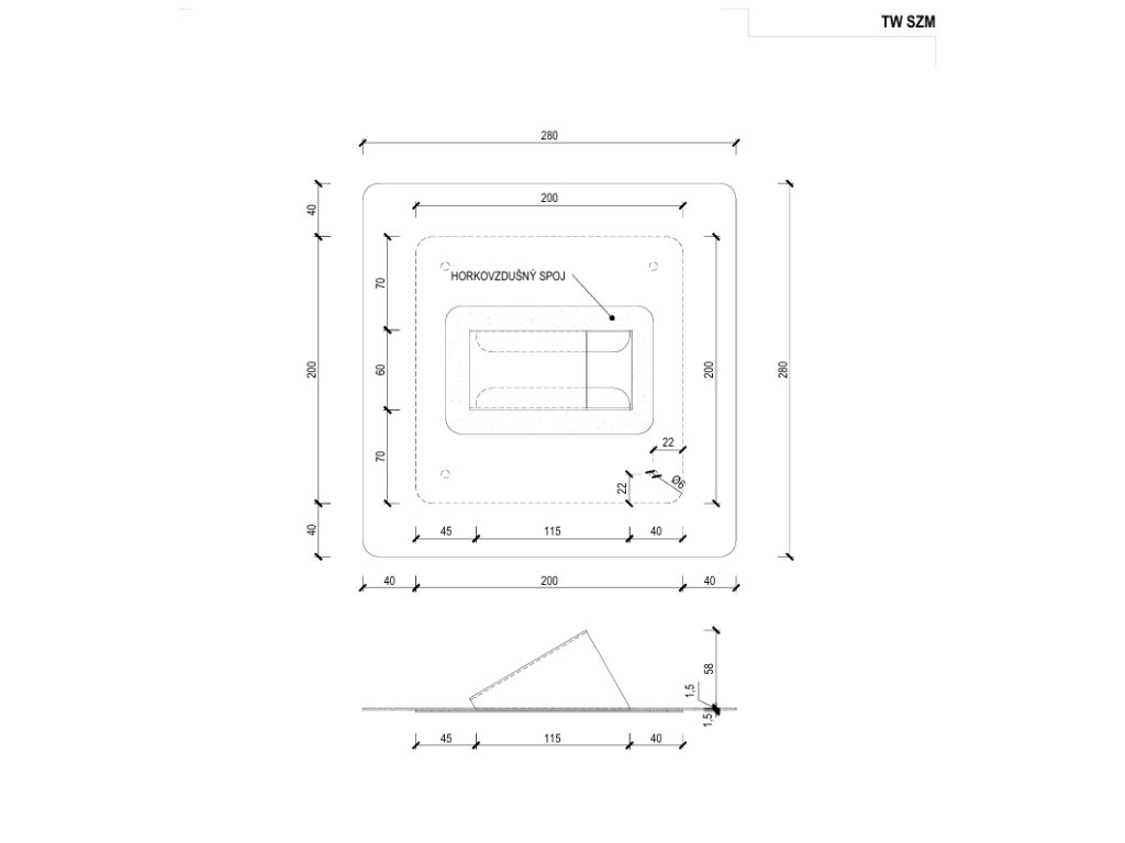 Spodný diel štvorcového tvaru slúži na ukotvenie snehovej zábrany ku konštrukčnému podkladu a je opatrený v rohoch otvormi s priemerom 6,2 mm. Na ploche je integrovaná manžeta hydroizolácie z fólie na báze mPVC.