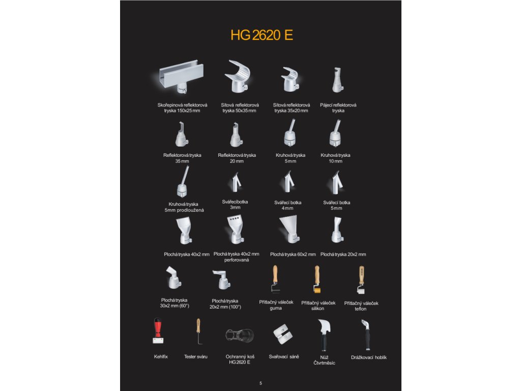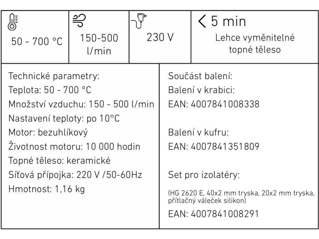 Teplovzdušná pištoľ HG 2620 E. 2300 W, nastavenie teploty od 50 - 700 ° C cez joystick. Regulácia prietoku vzduchu 150 – 500 l/min. Vybavený LCD displejom a indikátorom zvyškového tepla. Bezkefový motor, integrovaný jemný prachový filter, vhodný pre stavenisko.