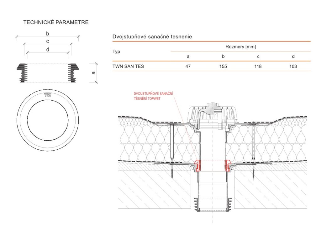 Systémové tesnenie určené pre dvojstupňové odvodnenie sanačných vpustí. Možné kombinovať so sanačnými vpusťami TW SAN a jednostennými vpusťami TWJ.