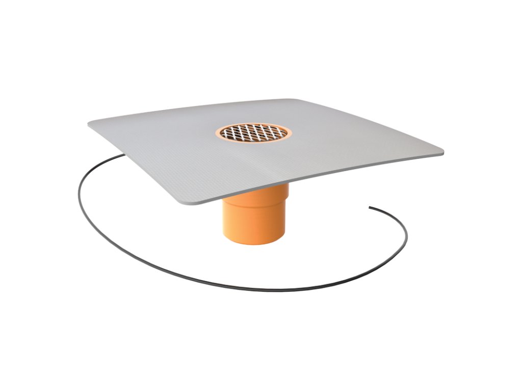 Vodorovná vyhrievaná balkónová vpusť s manžetou z hydroizolačnej fólie na báze mäkčeného PVC - jednostenná, s ochranným košom.