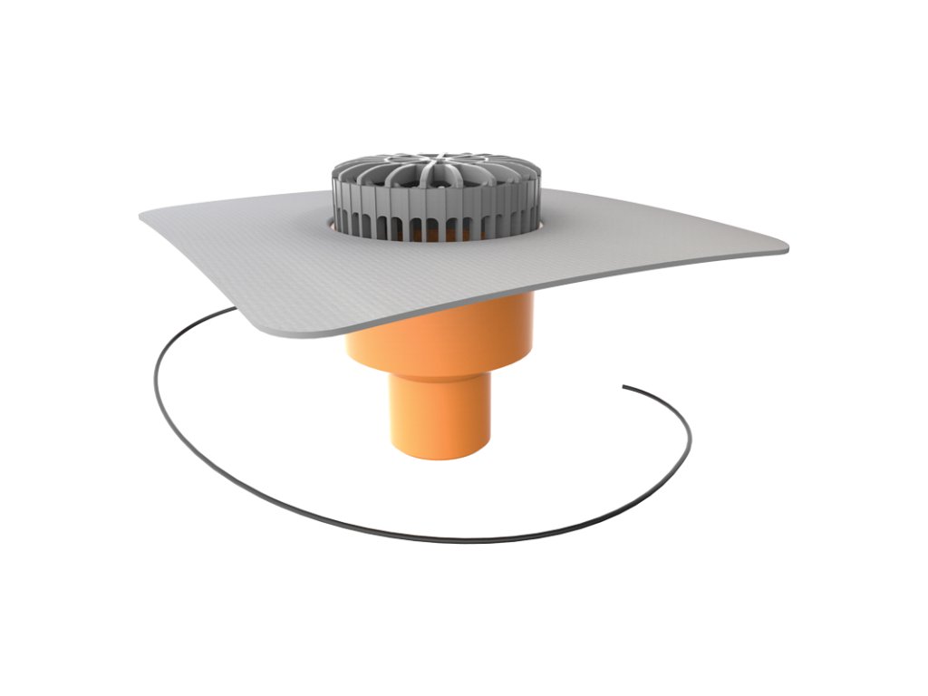 Vyhrievaná terasová vpusť zvislá s PVC manžetou z hydroizolačnej fólie na báze mäkčeného PVC, tepelne izolovaná - dvojstenná s ochranným košom.