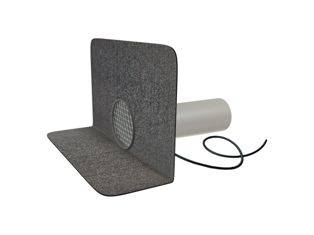 Vyhrievaný okrúhly strešný chrlič s bitumenovou manžetou z modifikovaného asfaltového pásu, s ochranným košom.